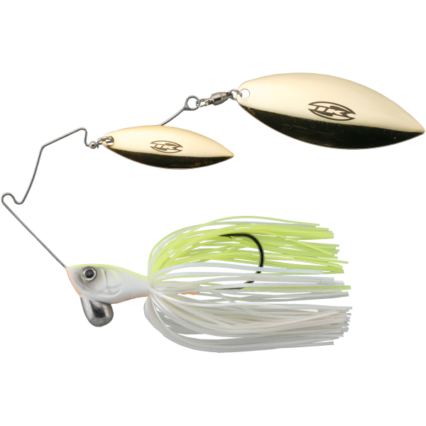 Spinnerbait con palette Tandem Willow (1 Willow leaf e 1 Colorado leaf). La forma a T della testa piombata è studiata per mantenere un assetto di nuoto orizzontale, e per lasciare la parte dell'amo...